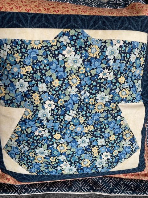 Produced for us by a generous and creative brainstrust supporter, this cushion cover features a blue and yellow floral print kimono, surrounded by borders in blue, red and beigh, and blue patterned fabrics.
